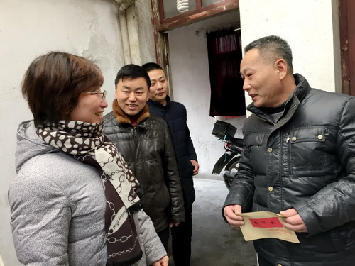 2018年2月9日上午,在傳統(tǒng)新春佳節(jié)即將到來之際,民建泰州市委專職副主委兼秘書長殷紅蘭帶領(lǐng)機關(guān)人員一行赴興化市戴南鎮(zhèn)人民和護國社區(qū)開展“思源工程―生育關(guān)懷行動”,逐一慰問失獨家庭,了解他們的身體和生活狀況,給他們送去慰問金和水果,祝愿他們新年吉祥!身體建康!過一個歡樂祥和的春節(jié)!受慰問的家庭非常感謝民建組織充滿關(guān)愛的走訪,在寒冷的冬天里給他們帶來絲絲溫暖。